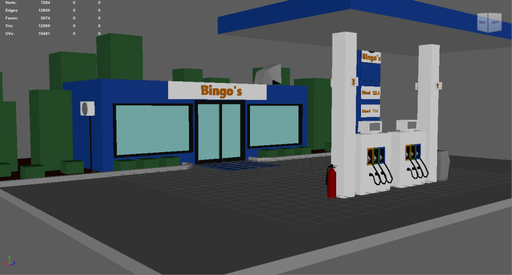 Here is a low-poly diorama of a petrol station. The task was to create a low-poly diorama of a building, which created a good exercise in understanding how to reduce poly counts and how to manipulate shapes to represent the objects that are required.