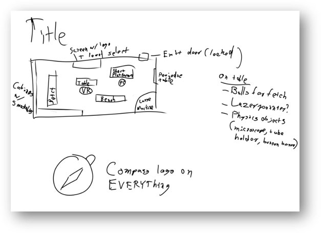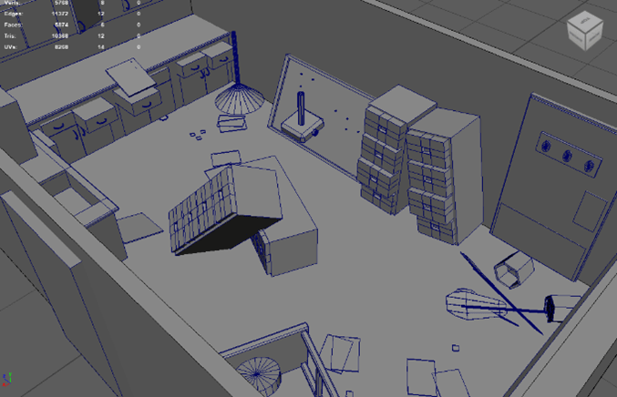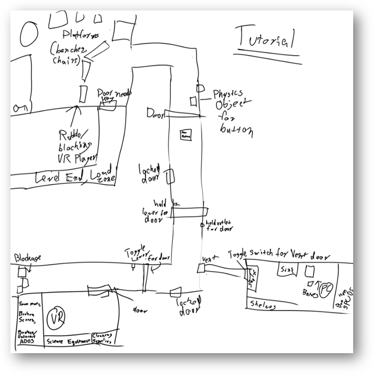 The design of the tutorial level was largely unchanged between pre-production and production. The level starts with each player locked in their own room. The VR player is locked behind a door, which requires a key hidden in the room to open, teaching them about doors and keys. This leads into a room with a large door and a button, which teaches that buttons can manipulate the world in more than one way. The PC player starts in a room with a closed door, with the only way out being a jump through a vent to teach the basic controls of a 3D platformer, where they meet up with the VR player. The next rooms involve using teamwork to open the door and discover mechanics, first by plugging SPUD’s tail into a socket, and then having SPUD hold a door open for ADOS while they grab a physics object to let SPUD through. The final room has a shelf that is too high for SPUD to jump to, and too far for ADOS to teleport to, so throwing SPUD is required to reach that shelf, further teaching the mechanics and the importance of teamwork. This shelf contains a key, which the VR player knows will unlock the locked door in front of them. Crafty players may also realise that with the help of the spare cardboard box, SPUD can jump up to the shelf, teaching players to look for multiple solutions and solve puzzles in creative ways.